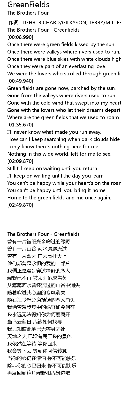 | [00:09.290] | Once there were green fields kissed by the sun. |