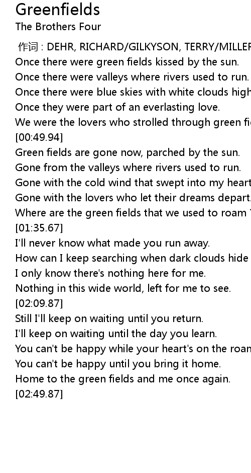 | [00:09.29] | Once there were green fields kissed by the sun. |