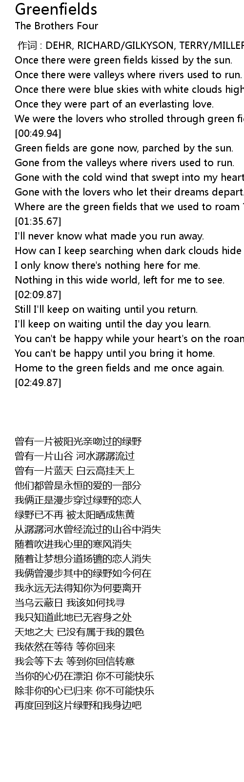 | [00:09.29] | Once there were green fields kissed by the sun. |