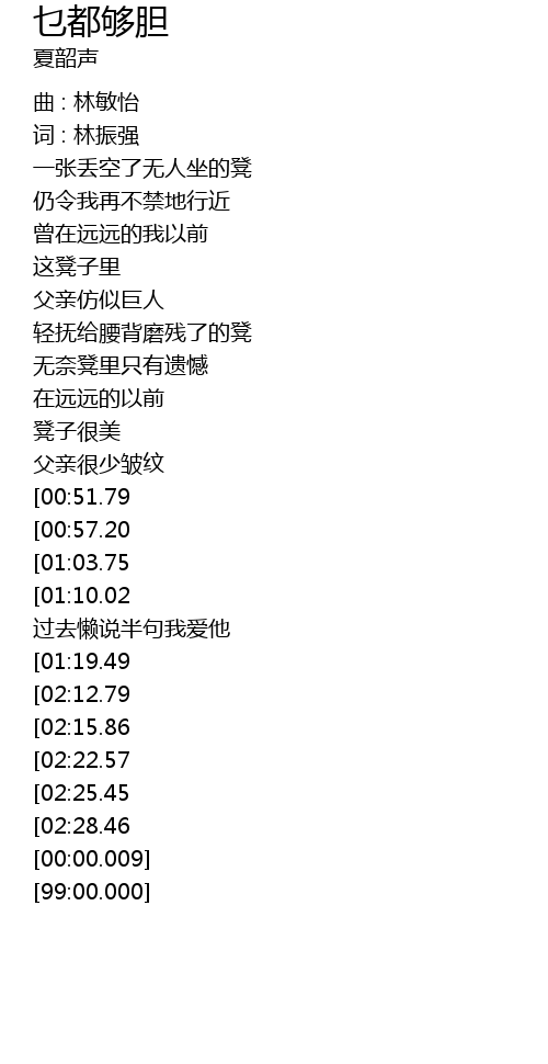 | [01:42.18][00:51.79] | 独望着空凳原我能 |