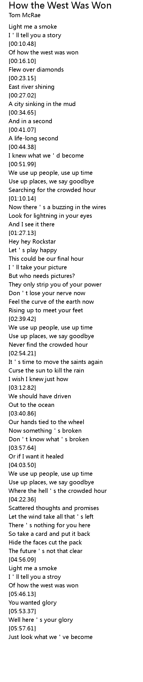 | [00:11.60] | Of how the west was won |