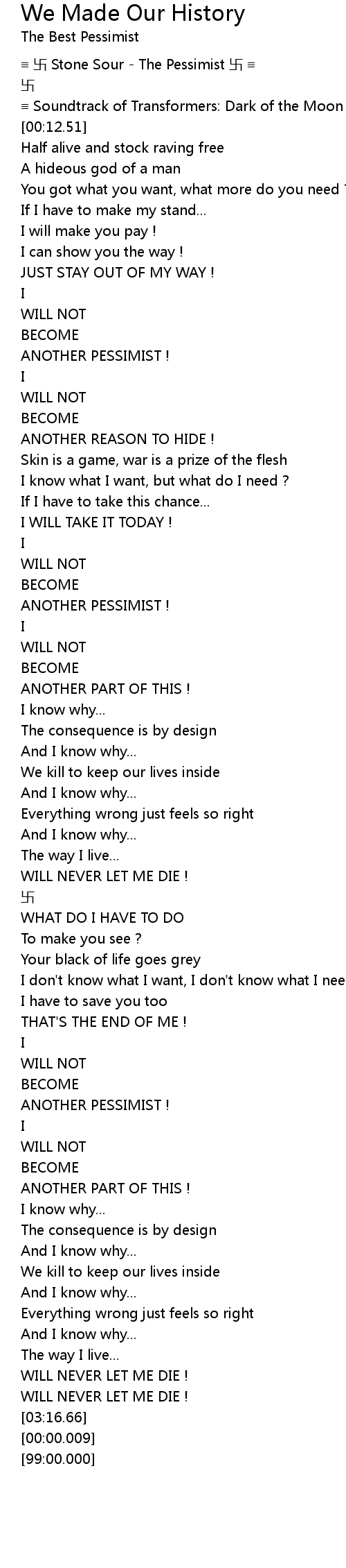 | [00:00.48] | ≡ 卐 Stone Sour - The Pessimist 卐 ≡ |