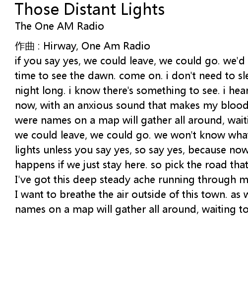 | if you say yes, we could leave, we could go. we' d be gone. we could get there in time to see the dawn. come on. i don' t need to sleep. i' ll keep driving all night long. i know there' s something to see. i hear it calling to me every night now, with an anxious sound that makes my blood pound. as we drive down, what were names on a map will gather all around, waiting to be found. if you say yes, we could leave, we could go. we won' t know what awaits us in those distant lights unless you say yes, so say yes, because now our only fear should be what happens if we just stay here. so pick the road that we' ll take. | |