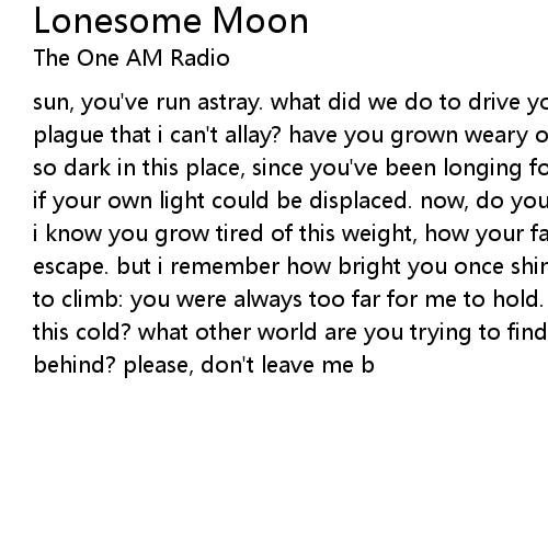 sun, you've run astray. what did we do to drive you away? does some new fear plague that i can't allay? have you grown weary of shining all day? it's grown so dark in this place, since you've been longing for the shade on your face. as if your own light could be displaced. now, do you run from what it illuminates? i know you grow tired of this weight, how your fate is a burden you'd hope to escape. but i remember how bright you once shined. i remember how high you used to climb: you were always too far for me to hold. would you let me grow old in this cold? what other world are you trying to find? are you going to leave me behind? please, don't leave me b |