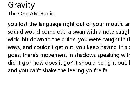 you lost the language right out of your mouth. an instinct to scream, but no sound would come out. a swan with a note caught in her throat. burnt out the wick. bit down to the quick. you were caught in the drag and carried a long ways, and couldn't get out. you keep having this dream, but can't recall how it goes. there's movement in shadows speaking with voices you know you know. how did it go? how does it go? it should be light out, but you can't see a thing. and you can't shake the feeling you're fa |