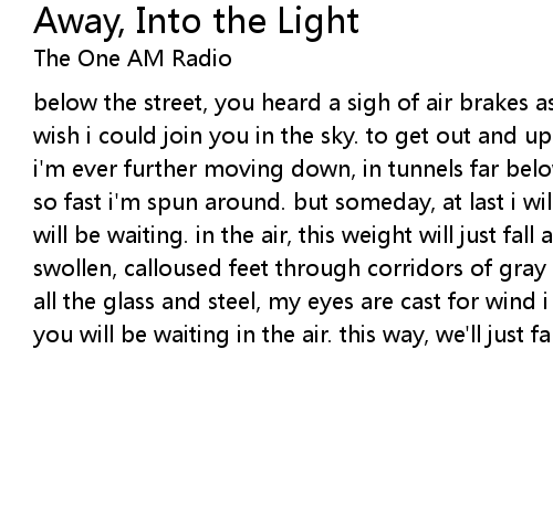 below the street, you heard a sigh of air brakes as a long good-bye. oh how i wish i could join you in the sky. to get out and up, away, into the light. but i'm ever further moving down, in tunnels far below the ground. careening past, so fast i'm spun around. but someday, at last i will be found in the air. you will be waiting. in the air, this weight will just fall away. i walked with swollen, calloused feet through corridors of gray concrete. high overhead, past all the glass and steel, my eyes are cast for wind i cannot feel, in the air. you will be waiting in the air. this way, we'll just fall |