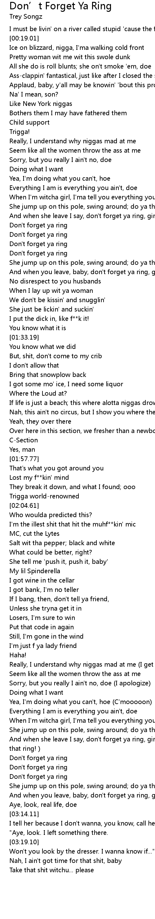 And when she leave I say, don't forget ya ring, girl (Don't forget that ring! ) |