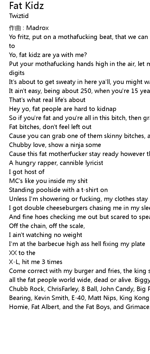 | Come correct with my burger and fries, the king sized" This song is dedicated to all the fat people world wide, dead or alive. Biggy Smalls, The One Man Gang, Chubb Rock, ChrisFarley, 8 Ball, John Candy, Big Pun, Bam Bam Bigalow, Fred Bearing, Kevin Smith, E40, Matt Nips, King Kong Bundy, Fat Joe, Blaze Ya Dead Homie, Fat Albert, and the Fat Boys, and Grimace. Monoxide use to be fat." |