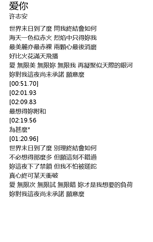 | [02:35.35][02:09.83][00:59.80] | 能愛著妳苦也未去躲 愛妳 最想得妳附和 |