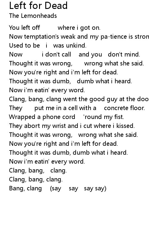 | Now you're right and i'm left for dead. | |