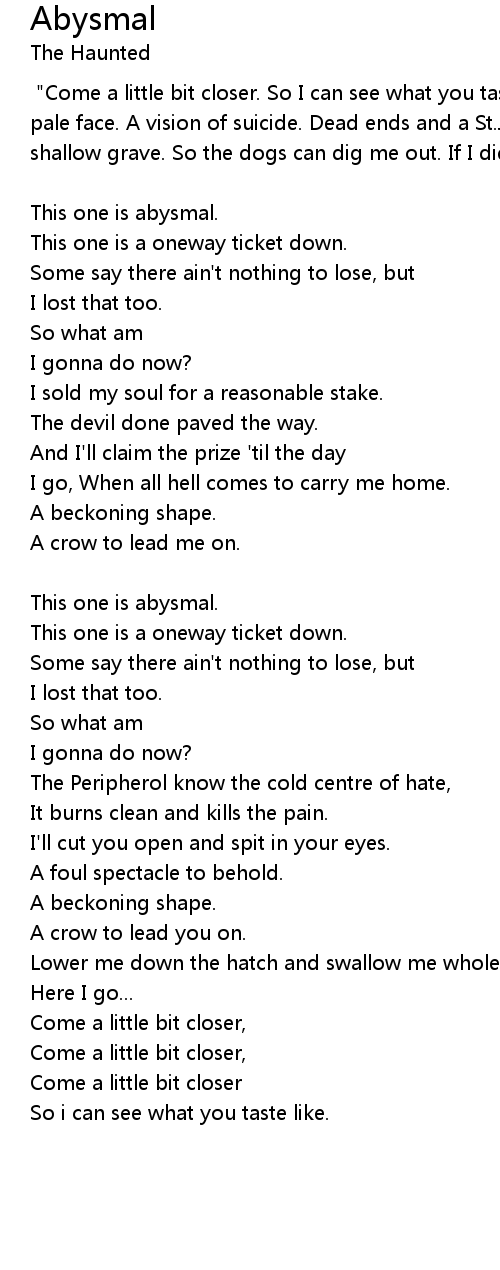 [Dolving talks] "Come a little bit closer. So I can see what you taste like. A pale face. A vision of suicide. Dead ends and a St.Jude figurine. Bury me in a shallow grave. So the dogs can dig me out. If I die tonight, well that suits me fine. 'Caus I'd be better off covered in lye." [Chorus:] |