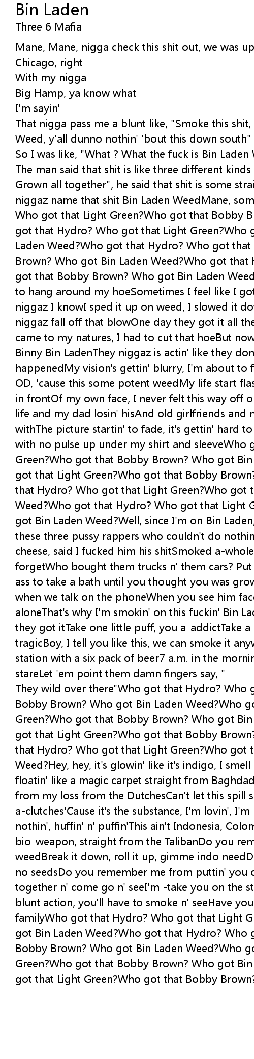 Grown all together", he said that shit is some straight killerThem Chicago niggaz name that shit Bin Laden WeedMane, some straight fieWho got that Hydro? Who got that Light Green?Who got that Bobby Brown? Who got Bin Laden Weed?Who got that Hydro? Who got that Light Green?Who got that Bobby Brown? Who got Bin Laden Weed?Who got that Hydro? Who got that Light Green?Who got that Bobby Brown? Who got Bin Laden Weed?Who got that Hydro? Who got that Light Green?Who got that Bobby Brown? Who got Bin Laden Weed?I swear, sometimes I gotta get high to hang around my hoeSometimes I feel like I gotta get high to hang 'round niggaz I knowI sped it up on weed, I slowed it down on snow'Cause I seen so many niggaz fall off that blowOne day they got it all then they say shit to showSo I came to my natures, I had to cut that hoeBut now I'm feelin' happy, I'm on that Binny Bin LadenThey niggaz is actin' like they don't know what the fuck just happenedMy vision's gettin' blurry, I'm about to fall asleepOr am I dyin' if I OD, 'cause this some potent weedMy life start flashin' like holograms like right in frontOf my own face, I never felt this way off one bluntI see my son gainin' life and my dad losin' hisAnd old girlfriends and niggaz I shouldn't have hung withThe picture startin' to fade, it's gettin' hard to breathI'm blackin' out with no pulse up under my shirt and sleeveWho got that Hydro? Who got that Light Green?Who got that Bobby Brown? Who got Bin Laden Weed?Who got that Hydro? Who got that Light Green?Who got that Bobby Brown? Who got Bin Laden Weed?Who got that Hydro? Who got that Light Green?Who got that Bobby Brown? Who got Bin Laden Weed?Who got that Hydro? Who got that Light Green?Who got that Bobby Brown ? Who got Bin Laden Weed?Well, since I'm on Bin Laden, let me tell you a-story'Bout these three pussy rappers who couldn't do nothin' for meGave 'em a-whole lotta cheese, said I fucked him his shitSmoked a-whole lotta weed, so they seem to forgetWho bought them trucks n' them cars? Put you bitches n' hoes?Who told your ass to take a bath until you thought you was grown ?Mane, I tell you he a killer when we talk on the phoneWhen you see him face to face he'll leave you aloneThat's why I'm smokin' on this fuckin' Bin LadenAll my niggaz in the hood they got itTake one little puff, you a-addictTake a gun to the head means tragicBoy, I tell you like this, we can smoke it anywhereIn front of police station with a six pack of beer7 a.m. in the morning just watchin' people stareLet 'em point them damn fingers say, " |