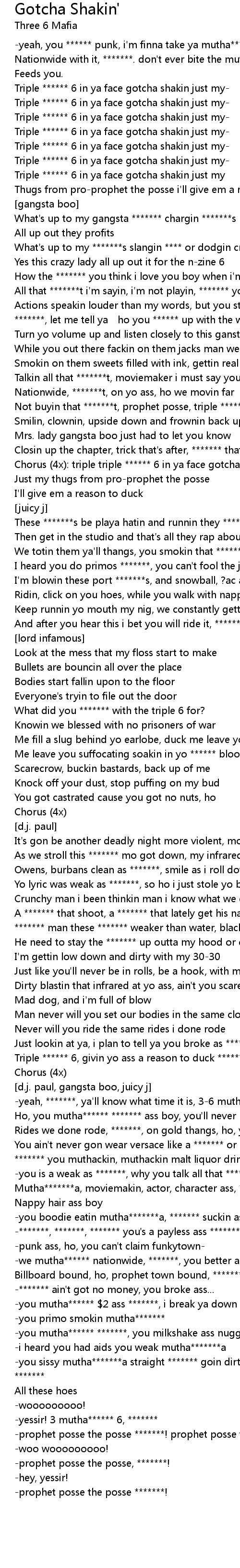 | Chorus (4x): triple triple ****** 6 in ya face gotcha shakin | |