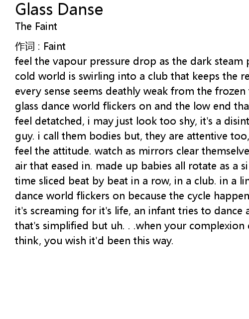 | feel the vapour pressure drop as the dark steam pours out the entrance. real cold world is swirling into a club that keeps the real life world out. where every sense seems deathly weak from the frozen time you spent in transit. the glass dance world flickers on and the low end thaws your anxious body maybe i feel detatched, i may just look too shy, it' s a disinterest not that i' m a timid guy. i call them bodies but, they are attentive too, i feel the social glare i feel the attitude. watch as mirrors clear themselves with the breath of frigid air that eased in. made up babies all rotate as a siren spins a beam of amber. time sliced beat by beat in a row, in a club. in a line, in the city. the glass dance world flickers on because the cycle happens enough: a baby falls out warm, it' s screaming for it' s life, an infant tries to dance as it grows up then dies. that' s simplified but uh. . . when your complexion dries, you wake up cold and think, you wish it' d been this way. |