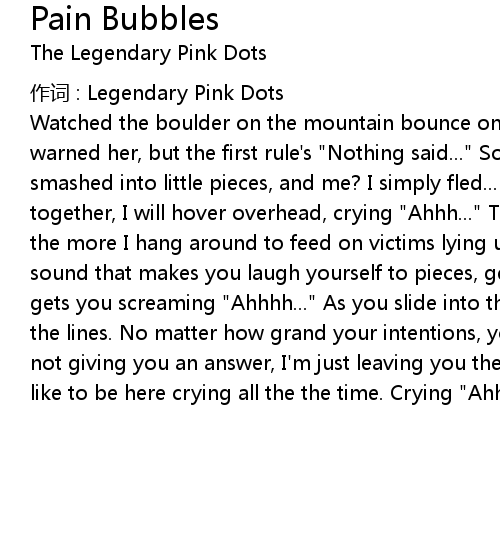 | Watched the boulder on the mountain bounce onto her head. I felt I should have warned her, but the first rule' s " Nothing said..." So nothing' s done... she smashed into little pieces, and me? I simply fled... When she puts herself together, I will hover overhead, crying " Ahhh..." The bigger the catastrophe, the more I hang around to feed on victims lying under me. I make that special sound that makes you laugh yourself to pieces, gets you rolling on the ground, gets you screaming " Ahhhh..." As you slide into the first dimension I pencil in the lines. No matter how grand your intentions, your destiny is all mine. I' m not giving you an answer, I' m just leaving you the time to find out what it' s like to be here crying all the the time. Crying " Ahhh...." |