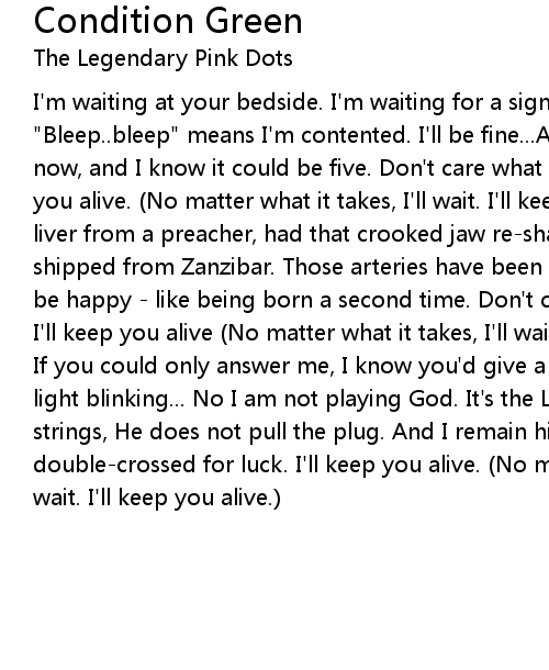 I'm waiting at your bedside. I'm waiting for a sign. I never sleep, "Bleep..bleep" means I'm contented. I'll be fine...And I know it's been a year now, and I know it could be five. Don't care what doctors recommend I'll keep you alive. (No matter what it takes, I'll wait. I'll keep you alive.) Took a liver from a preacher, had that crooked jaw re-shaped. That ol' heart was shipped from Zanzibar. Those arteries have been scraped. When it's over you'll be happy - like being born a second time. Don't care what the neighbours say, I'll keep you alive (No matter what it takes, I'll wait. I'll keep you alive...) If you could only answer me, I know you'd give a nod, and keep that little white light blinking... No I am not playing God. It's the Lord above who pulls the strings, He does not pull the plug. And I remain his humble servant, fingers double-crossed for luck. I'll keep you alive. (No matter what it takes, I'll wait. I'll keep you alive.) |