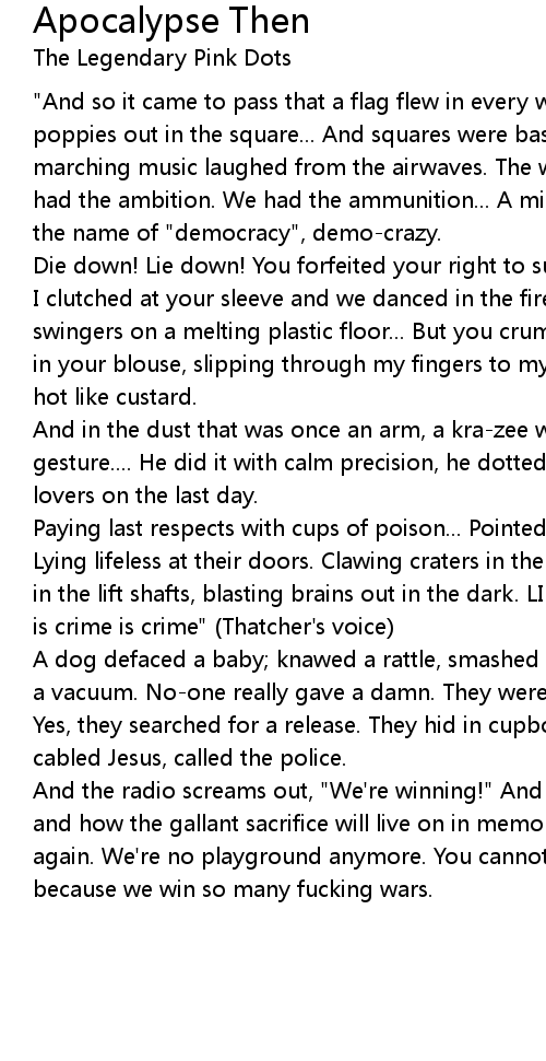 "And so it came to pass that a flag flew in every window and widows handed poppies out in the square... And squares were bashed and majors barked and marching music laughed from the airwaves. The waves were there to rule again. We had the ambition. We had the ammunition... A mission in the name of God... In the name of "democracy", demo-crazy. |