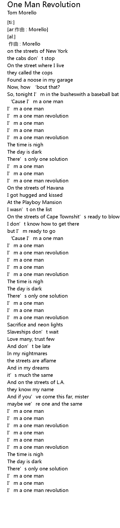| [00:29.97] | So, tonight I' m in the busheswith a baseball bat |