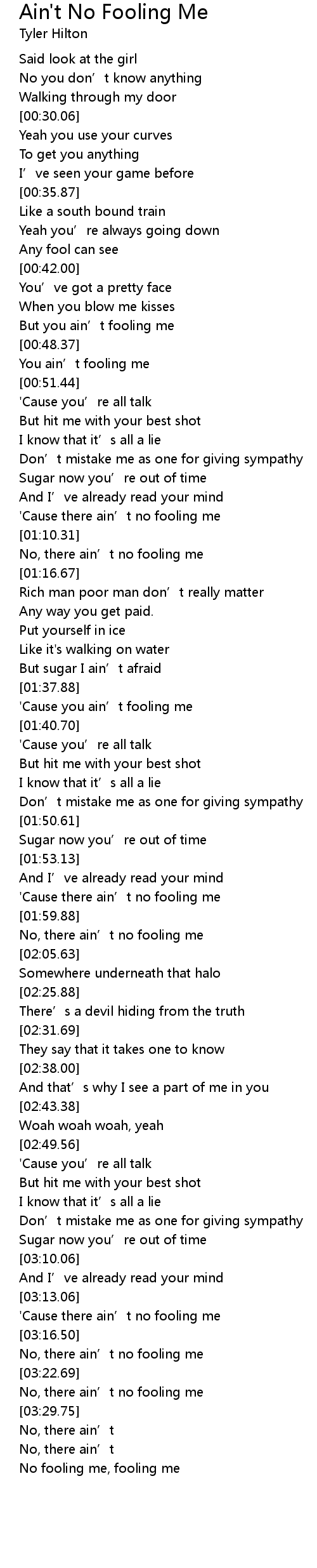 | [01:38.69] | 'Cause you ain’t fooling me |