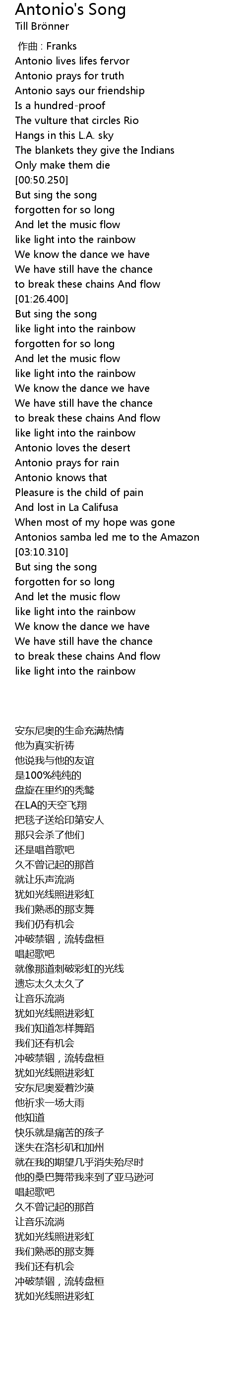 | [03:03.900] | Antonios samba led me to the Amazon |