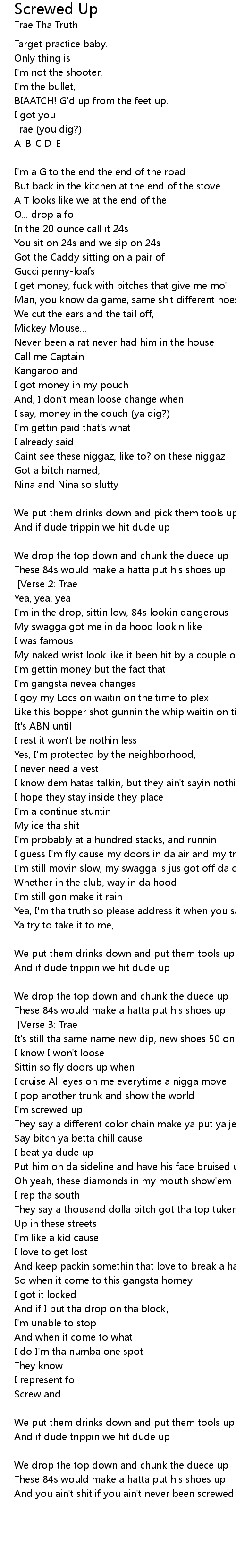 And you ain't shit if you ain't never been screwed up [x2] [Verse 2: Trae] |