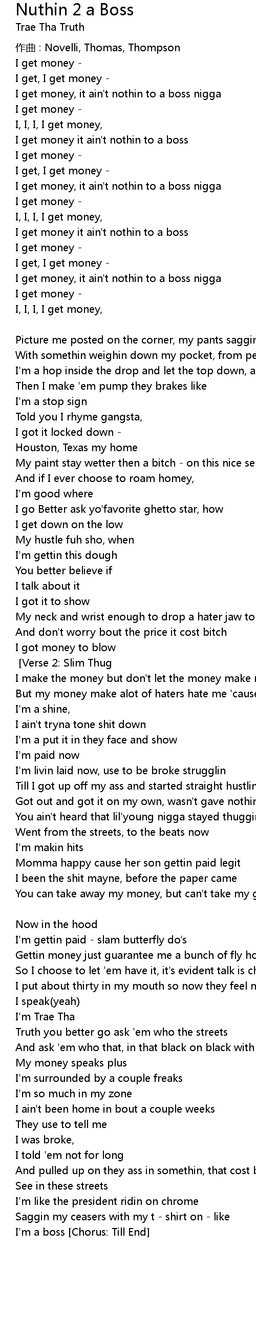 | I get money it ain' t nothin to a boss Verse 1: Trae | |