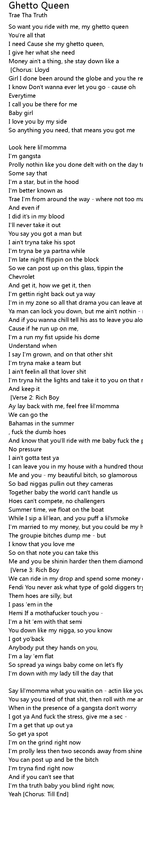 So just my ghetto queen gon' take that ride [Verse 1: Trae] |
