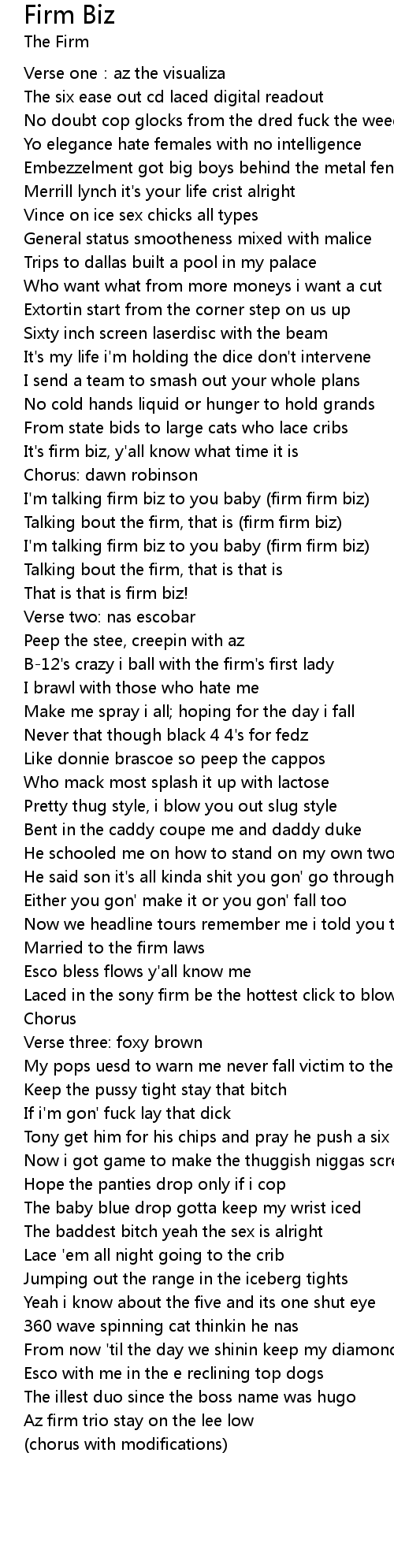 | I'm talking firm biz to you baby (firm firm biz) | |