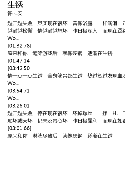 | [04:07.84][03:42.50][01:56.70] | * 情一点一点生锈 全身筋骨都生锈 热过烫过发现血脉己变僵 Wo... |