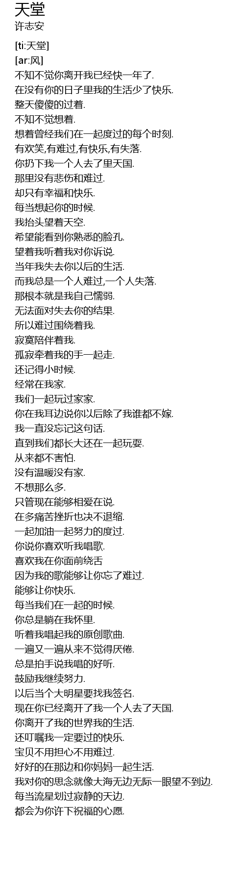 | [01:58.494] | xiàn zài nǐ yǐ jīng lí kāi le wǒ yí ge rén qù le tiān guó. |