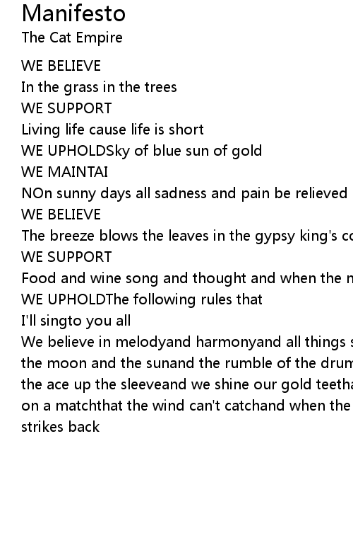 We believe in melodyand harmonyand all things sweetwe sing a yum-a-yum chumto the moon and the sunand the rumble of the drumsand the big fat beatwe believe in the ace up the sleeveand we shine our gold teethat the cats in the alleysa flame on a matchthat the wind can't catchand when the bad guys attackthe empire strikes back |