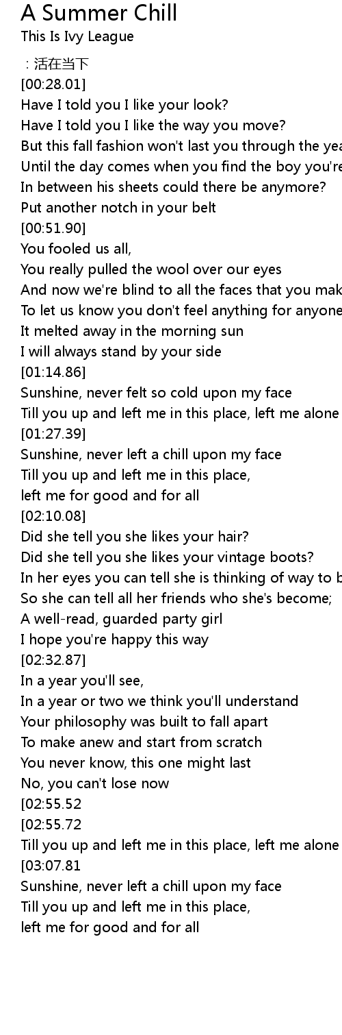 | [03:08.02] | Sunshine, never left a chill upon my face |