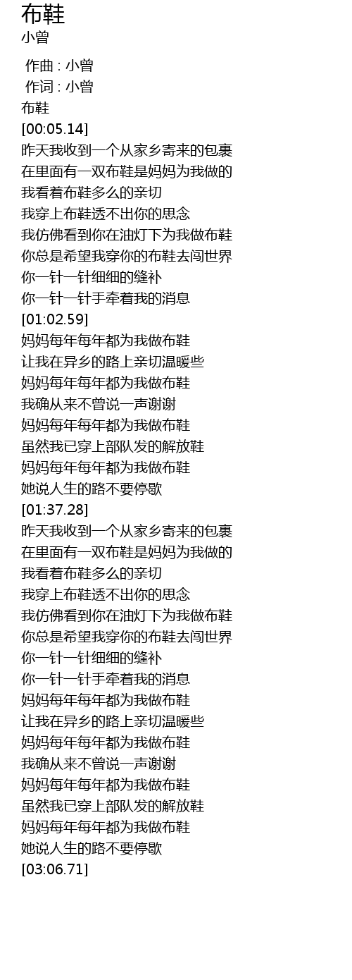 | [01:04.02] | 妈妈每年每年都为我做布鞋 |