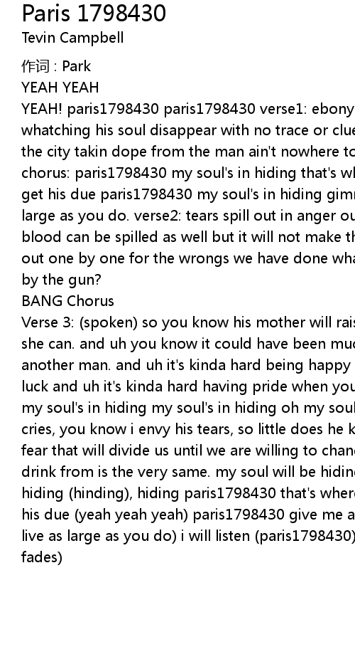 | Verse 3: spoken so you know his mother will raise him you know like the best she can. and uh you know it could have been much easier you know if she had like another man. and uh it' s kinda hard being happy you know livin on hopes and good luck and uh it' s kinda hard having pride when you ain' t got bucks. paris1798430 my soul' s in hiding my soul' s in hiding oh my soul' s in hiding when a baby cries, you know i envy his tears, so little does he know of the ignorance and fear that will divide us until we are willing to change, until the cup that we drink from is the very same. my soul will be hiding my soul will be hiding hiding hinding, hiding paris1798430 that' s where a brotha be hidin til he get his due yeah yeah yeah paris1798430 give me a call gimme a call when we can live as large as you do i will listen paris1798430 i will listen repeat til fades |