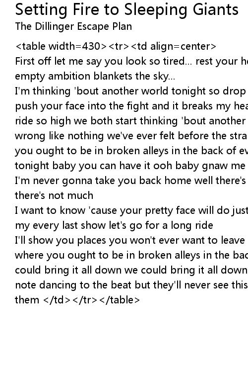 I'll show you places you won't ever want to leave the stranger's candy takes you where you ought to be in broken alleys in the back of every street tonight we could bring it all down we could bring it all down they think this body's a dead note dancing to the beat but they'll never see this corpse coming 'till it kills them </td></tr></table> |