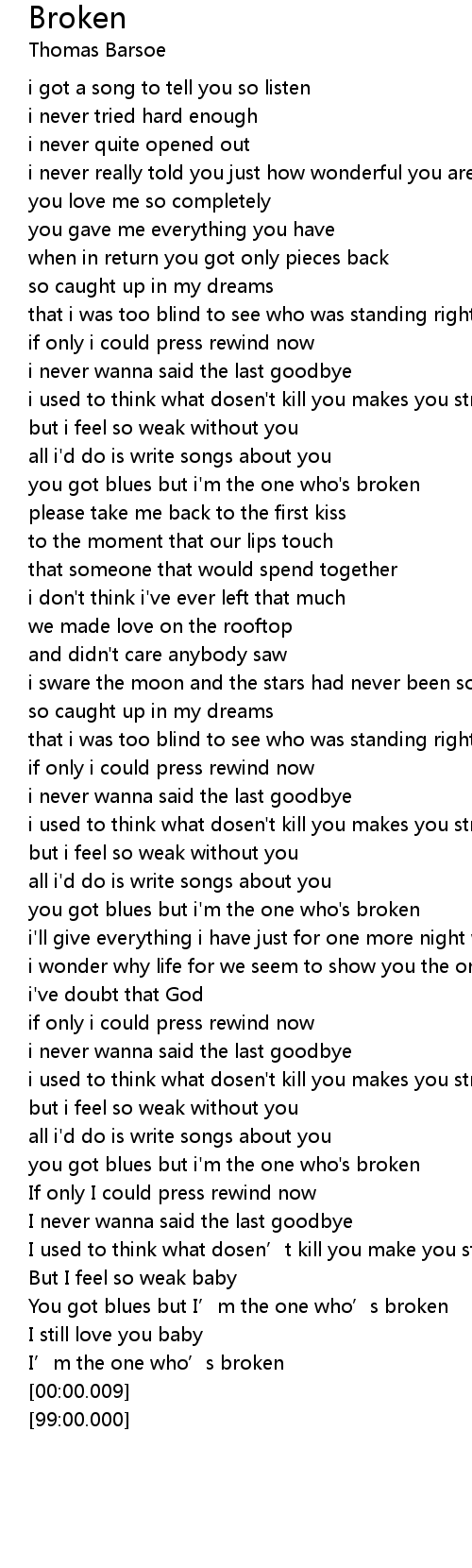 | [01:08.91] | you got blues but i' m the one who' s broken |