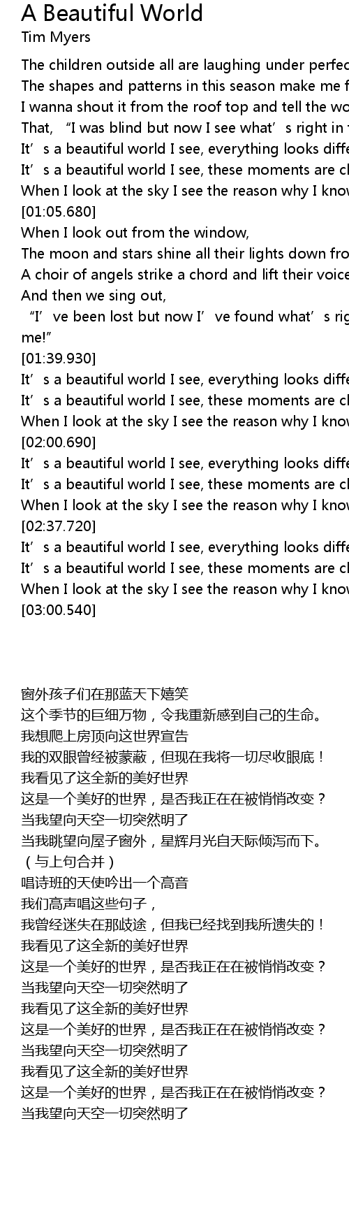 | [01:40.730] | It' s a beautiful world I see, everything looks differently |