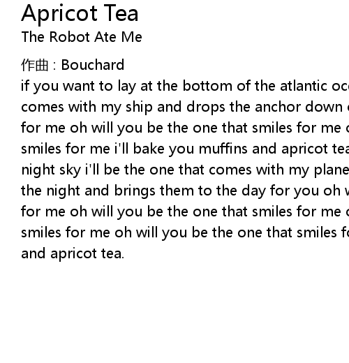 | if you want to lay at the bottom of the atlantic ocean i'll be the one that comes with my ship and drops the anchor down oh will you be the one that smiles for me oh will you be the one that smiles for me oh will you be the one that smiles for me i'll bake you muffins and apricot tea. if you want to glide in the night sky i'll be the one that comes with my plane and pulls the stars out of the night and brings them to the day for you oh will you be the one that smiles for me oh will you be the one that smiles for me oh will you be the one that smiles for me oh will you be the one that smiles for me i'll bake you muffins and apricot tea. |
