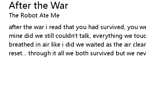 | after the war i read that you had survived, you were alive! your skin cut like mine did we still couldn't talk, everything we touched together froze you breathed in air like i did we waited as the air cleared we waited as time reset... through it all we both survived but we never learned quite how to l |