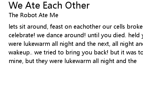| lets sit around, feast on eachother our cells broken apart by our teeth we celebrate! we dance around! until you died. held your hands in mine, but they were lukewarm all night and the next, all night and the next we wait for you to wakeup.. we tried to bring you back! but it was too late... held your hands in mine, but they were lukewarm all night and the |
