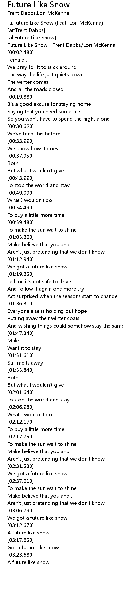 | [0-1:59.930] | Future Like Snow Trent Dabbs Lori McKenna |