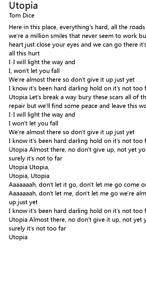 Utopia Almost there, no don't give up, not yet you're falling apart now but surely it's not to far |