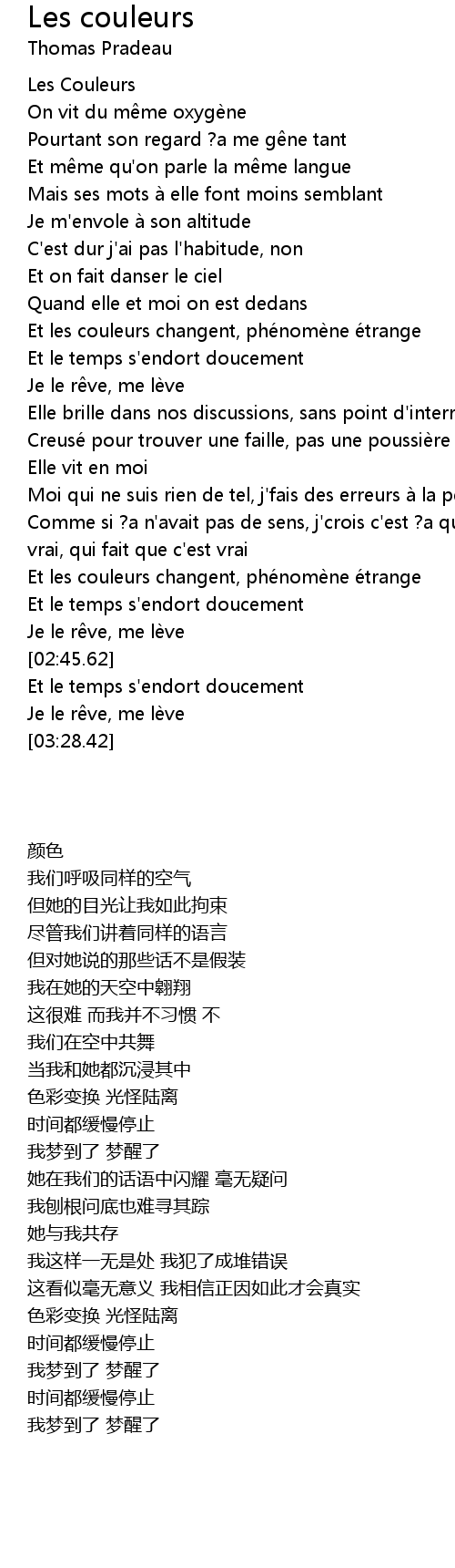 | [02:16.72] | Et les couleurs changent, phe nome ne e trange |