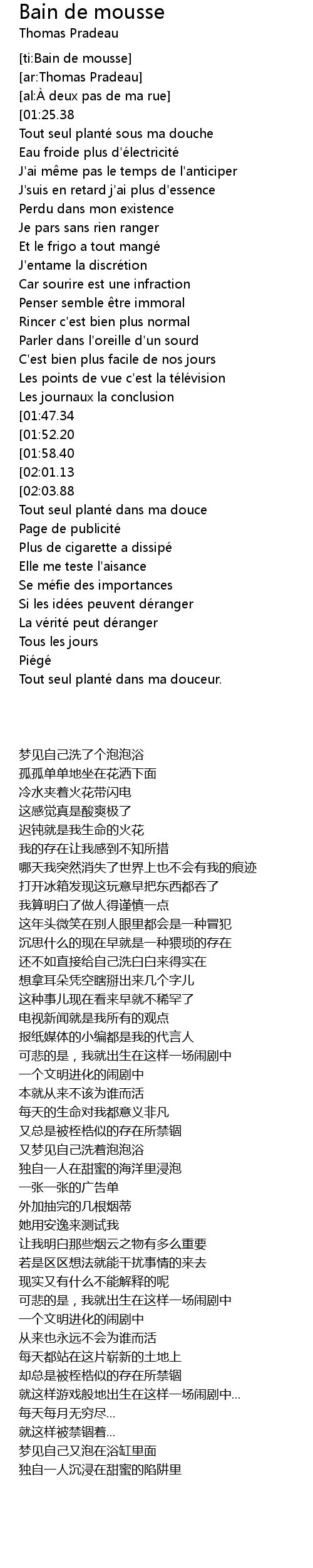 | [00:12.37][01:25.38][02:39.76] | Je rêve d'un bain de mousse |