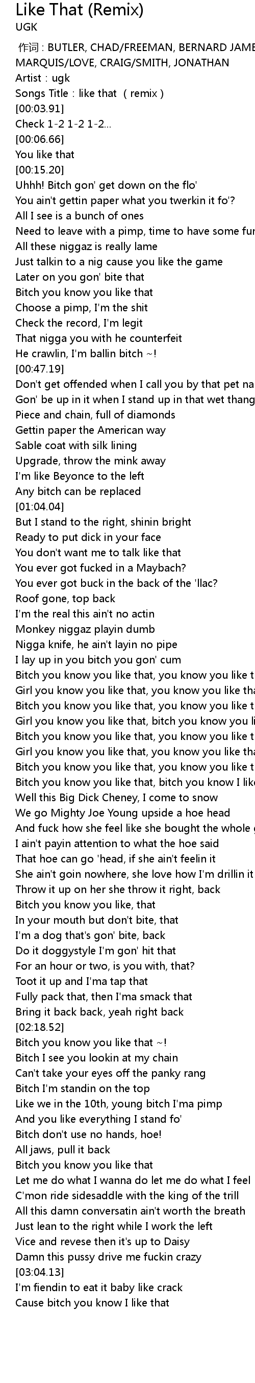 | [01:31.57] | Girl you know you like that, bitch you know you like that |