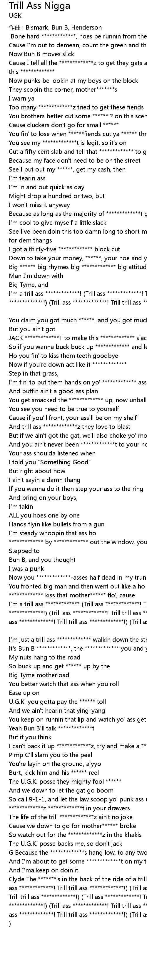 | I'm a trill ass ************* (Trill ass *************! Trill trill ass *************!) (Trill ass *************! Trill trill ass *************!) (Trill ass *************! Trill trill ass *************!) (Trill ass *************! Trill trill ass *************!) [Bun B] | |