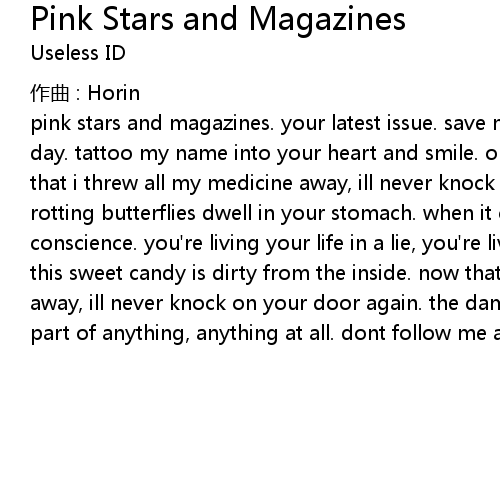 | pink stars and magazines. your latest issue. save me the drama queen for one day. tattoo my name into your heart and smile. obsession is your only way. now that i threw all my medicine away, ill never knock on your door again. these rotting butterflies dwell in your stomach. when it comes to you i have no conscience. you' re living your life in a lie, you' re living your life in a lie. this sweet candy is dirty from the inside. now that i threw all my medicine away, ill never knock on your door again. the damage is done we' ll never be a part of anything, anything at all. dont follow me around. |