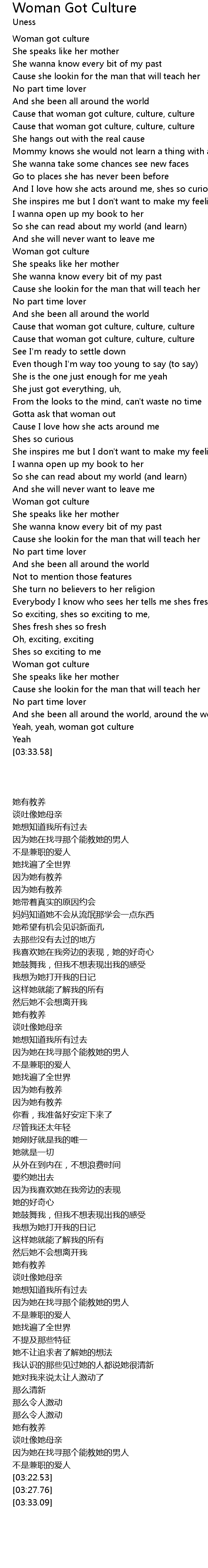 | [03:27.76] | Yeah, yeah, woman got culture |