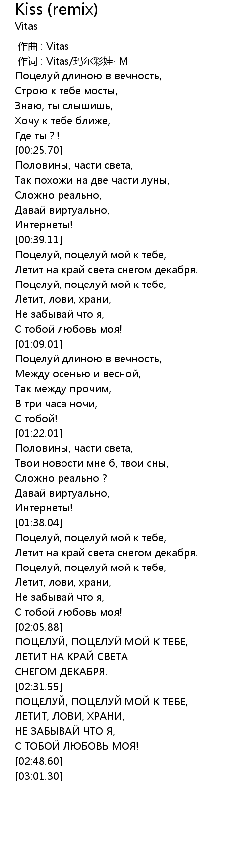 | [02:33.14] | ПОЦЕЛУЙ, ПОЦЕЛУЙ МОЙ К ТЕБЕ, |