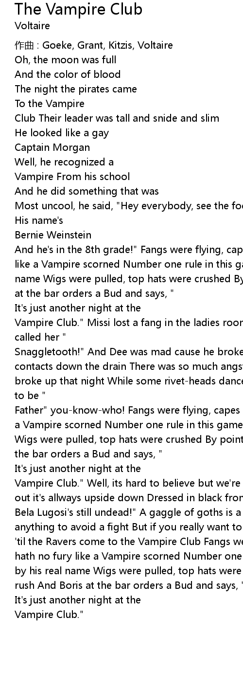 | Bela Lugosi' s still undead!" A gaggle of goths is a peaceful site We' d do anything to avoid a fight But if you really want to see some gore and blood Wait ' til the Ravers come to the Vampire Club Fangs were flying, capes were torn Hell hath no fury like a Vampire scorned Number one rule in this game: Never call one by his real name Wigs were pulled, top hats were crushed By pointy boots in a rush And Boris at the bar orders a Bud and says, " | |